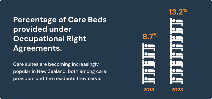 Care suites are becoming increasingly popular in New Zealand, both among care providers and the residents they serve. The percentage of the nation’s care beds provided through care suite accommodation has risen from 8.7% in 2018 to 13.2% in 2023.