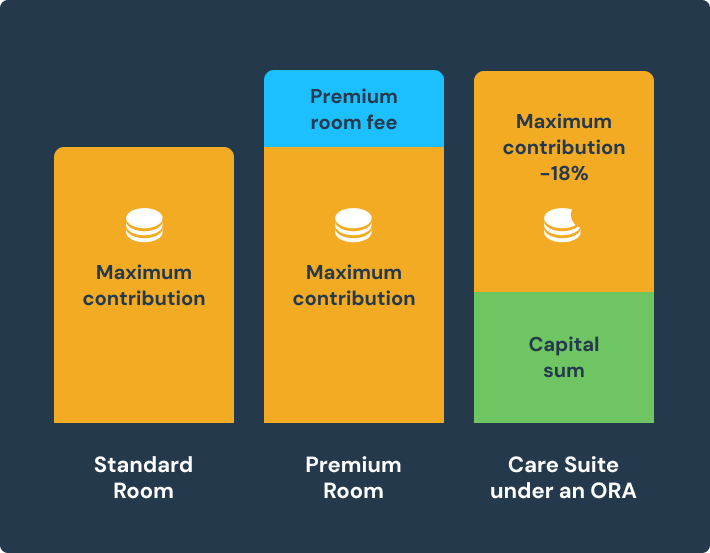 As residents in a care suite pay a capital sum for their accommodation, the maximum contribution is typically reduced by 18%* to reflect the covered accommodation portion.