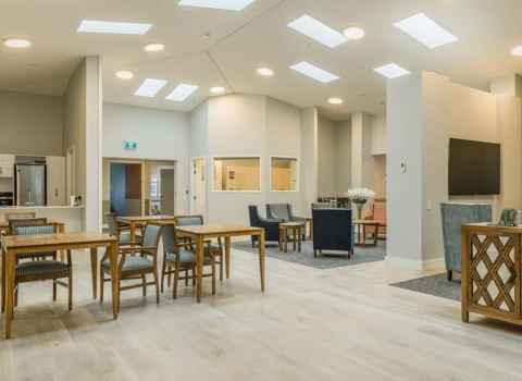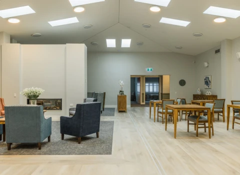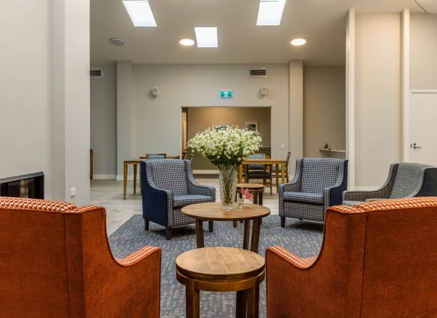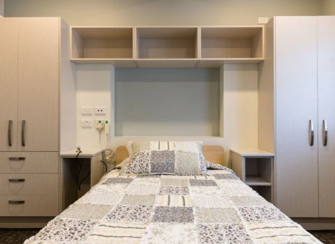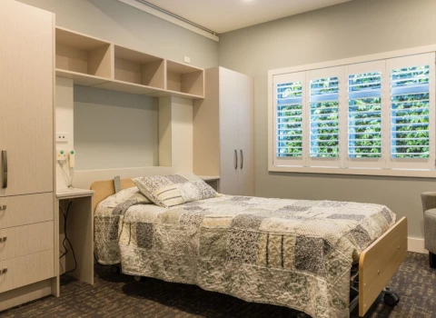 There are room types at Bryant House to cater for a variety of needs and budgets, including standard single rest home rooms, dementia care rooms, hospital care rooms with a shared bathroom, and hospital care rooms with a private ensuite. Rooms within the newly built hospital facility — opened in 2023 — are spacious and modern, with in-built joinery, a smart TV, wifi, and ceiling hoists.