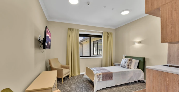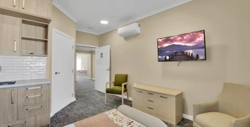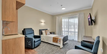 The care home offers modern, high-quality accommodation. Serviced apartments are spacious and feature a double bedroom, ensuite, separate living area with kitchenette, and ample storage. Care rooms are warm and comfortable, with space for a television, chair, and some small pieces of furniture. All accommodation is Ministry of Health certified for rest home level care, and care rooms are also certified for hospital level care.