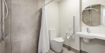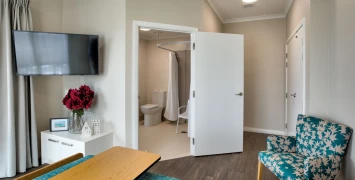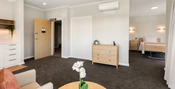The care home offers modern, high-quality accommodation. Serviced apartments are spacious and feature a double bedroom, ensuite, separate living area with kitchenette, and ample storage. Care rooms are warm and comfortable, with space for a television, chair, and some small pieces of furniture. All accommodation is Ministry of Health certified for rest home level care, and care rooms are also certified for hospital level care.