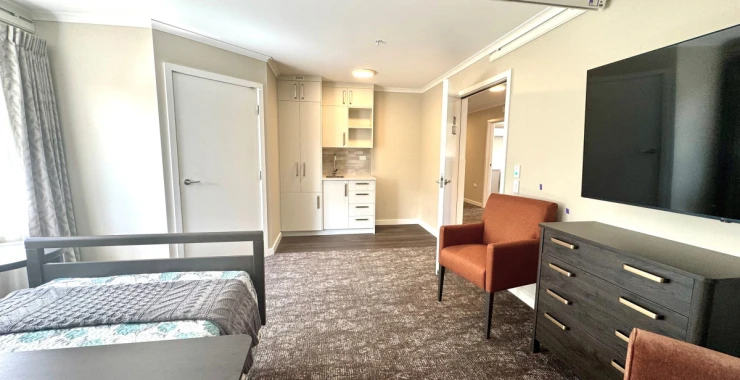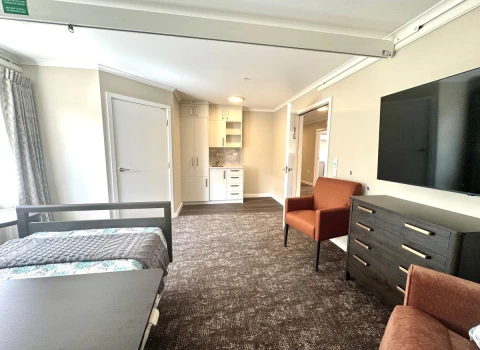 Our brand-new premium care suites are warm and comfortable, with space for a television, chair, and some small pieces of furniture. Certified by the Ministry of Health to provide rest home and hospital-level care.