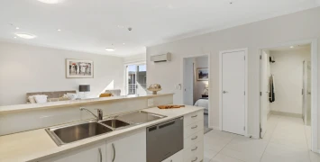 The spacious open plan living, kitchen and dining area enjoys a northeast aspect, capturing beautiful all-day sun and opening out to a private balcony. From here, take in views across the village gardens, mature protected trees and toward Cornwall Park, with glimpses of the Auckland City skyline and Sky Tower beyond.