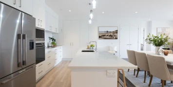 The stylish kitchen features high-quality appliances and ample counter space. Meal preparation is a delight, in the easy-to-maintain kitchen environment.