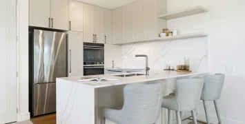 Perched on level five, apartment 502 enjoys an elevated south-east corner position with space, light and outlook in abundance. From this vantage point, you can take in the surrounding neighbourhood while still feeling wonderfully connected to the life of the village and the community beyond.