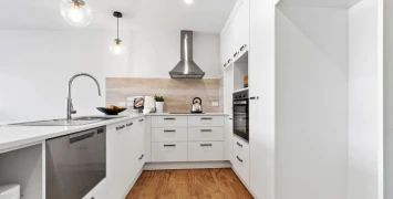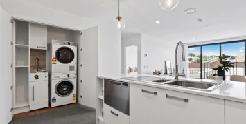 A full-sized kitchen with stunning stone benchtops, generous drawer storage, and a built-in dishwasher.