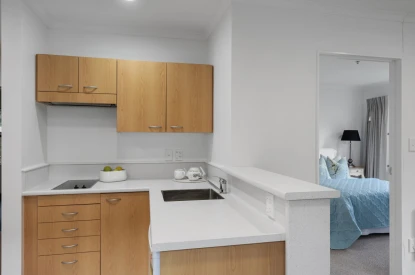 • Kitchenette with under bench fridge, finished with timber-look flooring