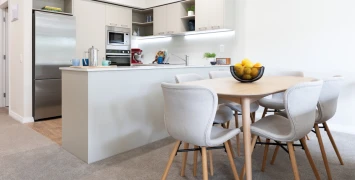 The entertainer’s kitchen is equipped with Fisher & Paykel appliances and soft-close drawers. Additional features include internal garage access, a separate storage unit, emergency call buttons, and 24/7 staff support for peace of mind.