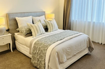 The 2 spacious bedrooms, each with their own bathroom ensures privacy when you have guests, or if you're a couple and need separate bedrooms. The quality feel is reflected in the level entry tiled showers. The master bedrooms benefits from an integrated walk-through wardrobe between bedroom and ensuite. Both bedrooms have large windows letting in plenty of light. Drapes and nets included in bedrooms and drapes in living area included.
