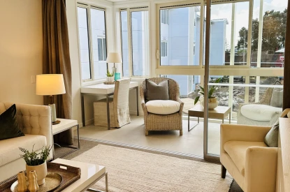 With beautiful views to the East, this stunning two-bedroom two-bathroom apartment is an entertainers' delight. Located on the first floor, it looks East towards our beautiful oasis inner courtyard, and is remarkably quiet and peaceful, lovely and warm.