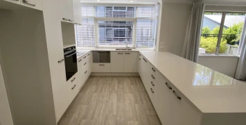 The stylish and modern kitchen is equipped with quality appliances, a stone benchtop, and soft-close drawers, and are large breakfast bar, flowing effortlessly into the spacious open-plan living and dining area.
