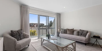 This bright, north-facing apartment offers elevated views of the water and village, with sun streaming into the open-plan living and dining area. The modern kitchen features ample storage with a breakfast bar, perfect for casual meals or entertaining.