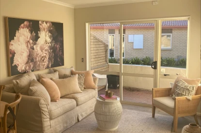 Inside the apartment there is a call bell system, wall-to-wall floor coverings (carpets and vinyl), wiring for Freeview, grab rails in shower and toilet, slip resistant linoleum, heated towel rail, laundry tub, outdoor patio with a foldaway clothes line.
