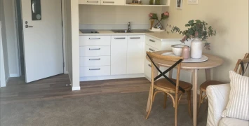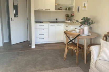 All of the studio apartments have one bedroom with ensuite, open plan lounge and kitchenette, and separate laundry area. Close to communal vegetable gardens and greenhouse, there is also a spacious communal lounge with a large screen TV and kitchen area with a dishwasher.