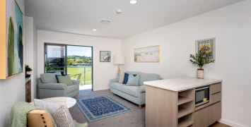 “Your spacious bedroom is thoughtfully designed with built-in robes and shelving, over-bed reading lights, a wall-mounted smart TV facility, and an emergency call system for peace of mind. A large window frames the stunning Taradale Hills, bringing light, comfort, and a sense of calm to your personal retreat.”