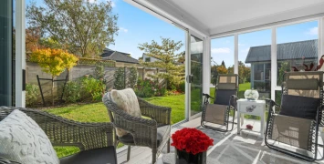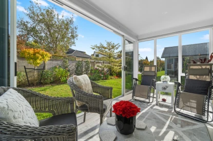 Year-round use of the enclosed deck is a fantastic bonus. You will enjoy the green outlook, and convenience of electric blinds.