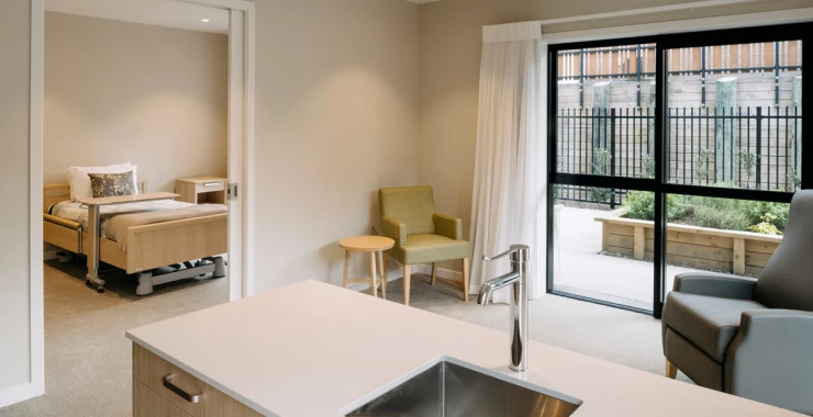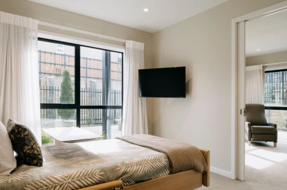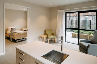 This large one-bedroom secure dementia care suite comes imbued with this same resident-centric philosophy. With medical features cleverly hidden away, residents enjoy a homely feel, with up to 53m2 of floor space, a separate bedroom and ensuite, kitchenette and living area. This secure care suite is north-east facing receiving the morning sun and views to the entrance.